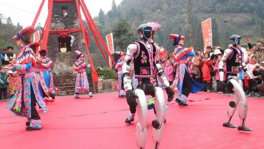 活動期間,南寶山鎮(zhèn)木梯羌寨處處洋溢著歡慶氛圍,文化傳承與民生溫度交織共生。從莊重的寨門迎新、祭祀祈福儀式,到釋比老人手持羊皮鼓吟唱經(jīng)文的千年信仰傳承;從《摘花椒》《永遠是一家》等傳統(tǒng)羌族歌舞展演,到身著迷你羌服的機器人跳沙朗舞的“科技+民俗”創(chuàng)意碰撞……每一個環(huán)節(jié)都承載著羌族文化的根脈,也傳遞著南寶山鎮(zhèn)發(fā)展文旅產(chǎn)業(yè)的具體實踐。