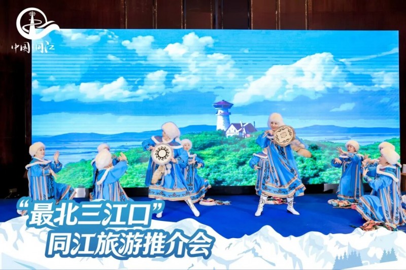 現(xiàn)場(chǎng)通過文創(chuàng)產(chǎn)品展示、宣傳片輪播、赫哲族舞蹈《赫尼那》迅速營(yíng)造出同江冰雪與民俗氛圍。