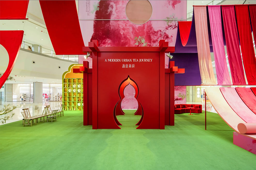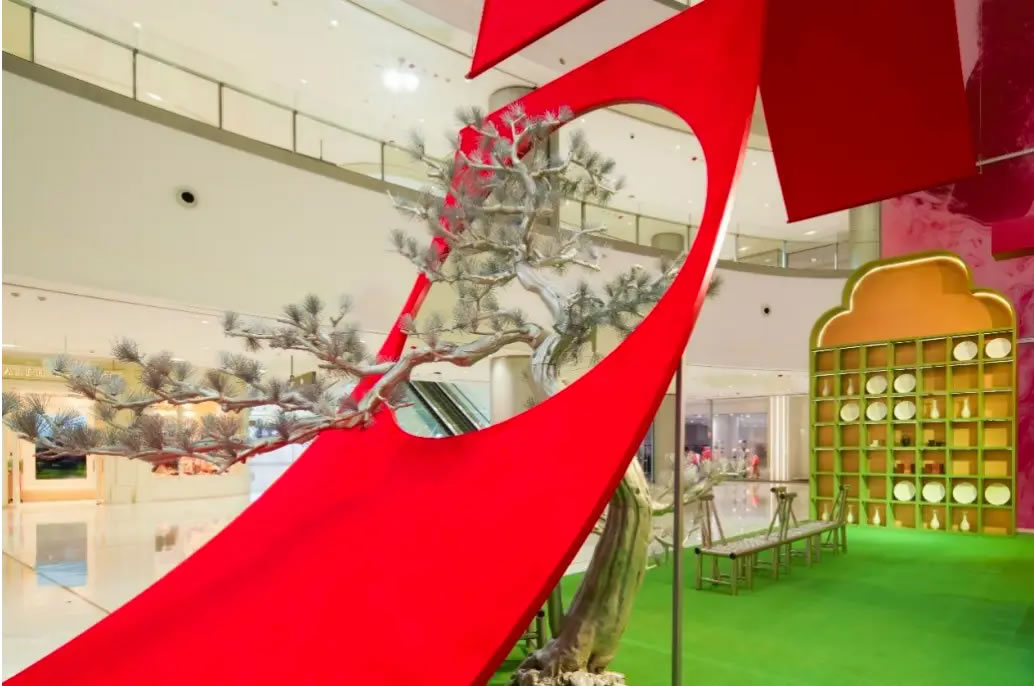 山水,并非遠(yuǎn)行才可得見。書法水墨藝術(shù)家劉玥首展作品《春山行遠(yuǎn)圖》以20米巨幅“山水開卷”,步入其中,與天地春意從容照面;紅色的帷幔落于銀色的松枝上,就像于山間松下靜謐的一隅,“幕下棲心”將是絕佳開年時(shí)尚大片的打卡處;松下銀椅,為你與摯友“漫敘往來”的相聚時(shí)刻營造出寧靜、松弛的氛圍;多寶閣中陳列著未經(jīng)雕琢的茶器素胚與場內(nèi)品牌萬仟堂,長沙尼依格羅酒店及tea'stone帶來的新春茶器,以“初芒蘊(yùn)能”詮釋著未來的無限可能與新生力量。轉(zhuǎn)身與“蒔光種愿” 四方亭相遇。葫蘆門朝四方而開,寓意著納四方福祿,步入其中,與數(shù)字交互藝術(shù)家吳旭首展作品《無限福祿》體驗(yàn)互動(dòng),跟隨指引揮動(dòng)手勢,觸發(fā)粒子凝聚為動(dòng)態(tài)“福”字,親手完成一場新春祈福儀式。我們把象征團(tuán)圓與喜悅的紅色沙發(fā)打造“盞間聚暖”,如懷抱般圍合的布局作為“歸處”的隱喻。與家人團(tuán)聚便是心歸處,這將是中國年最圓滿的意象。