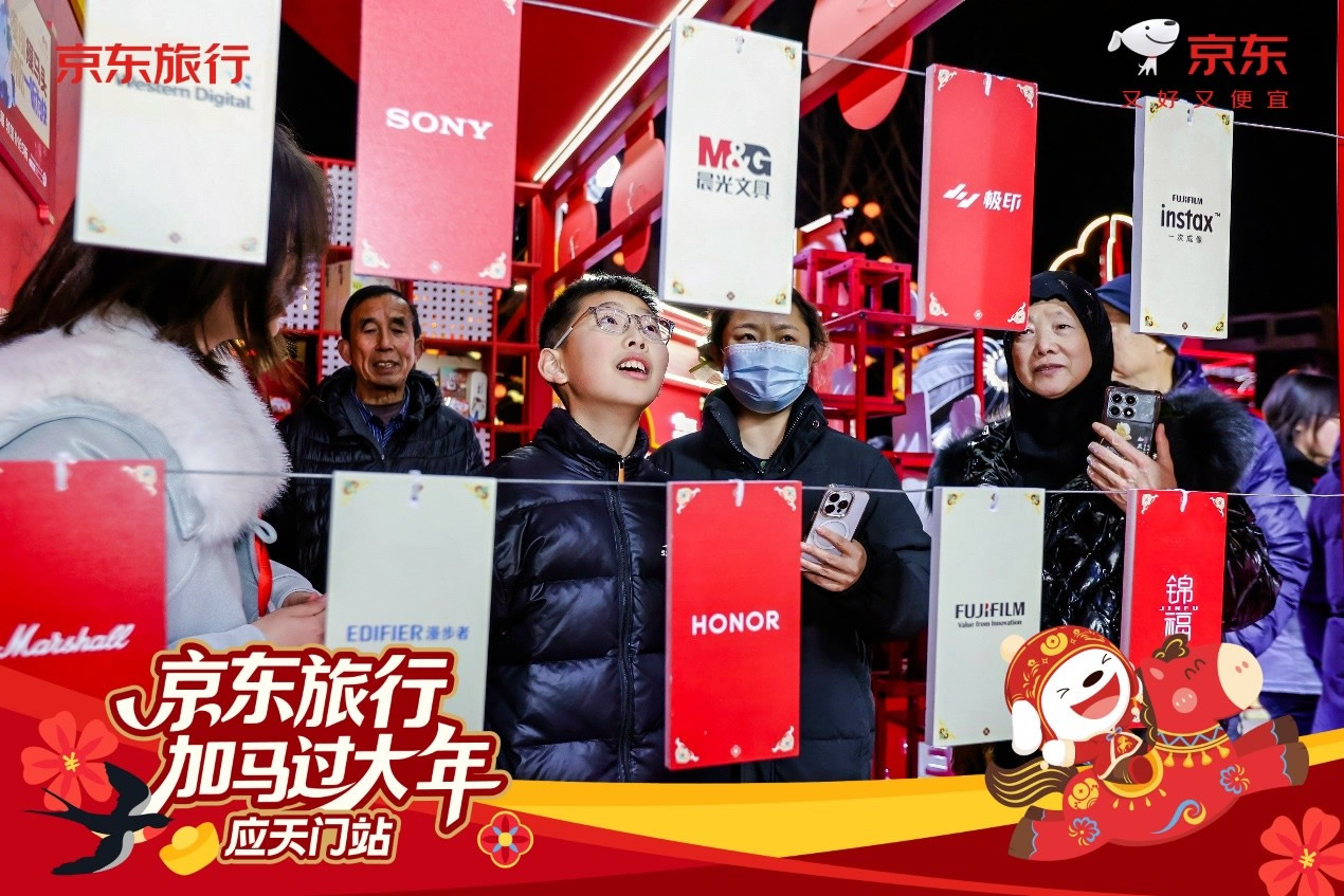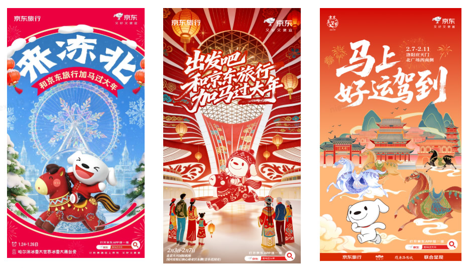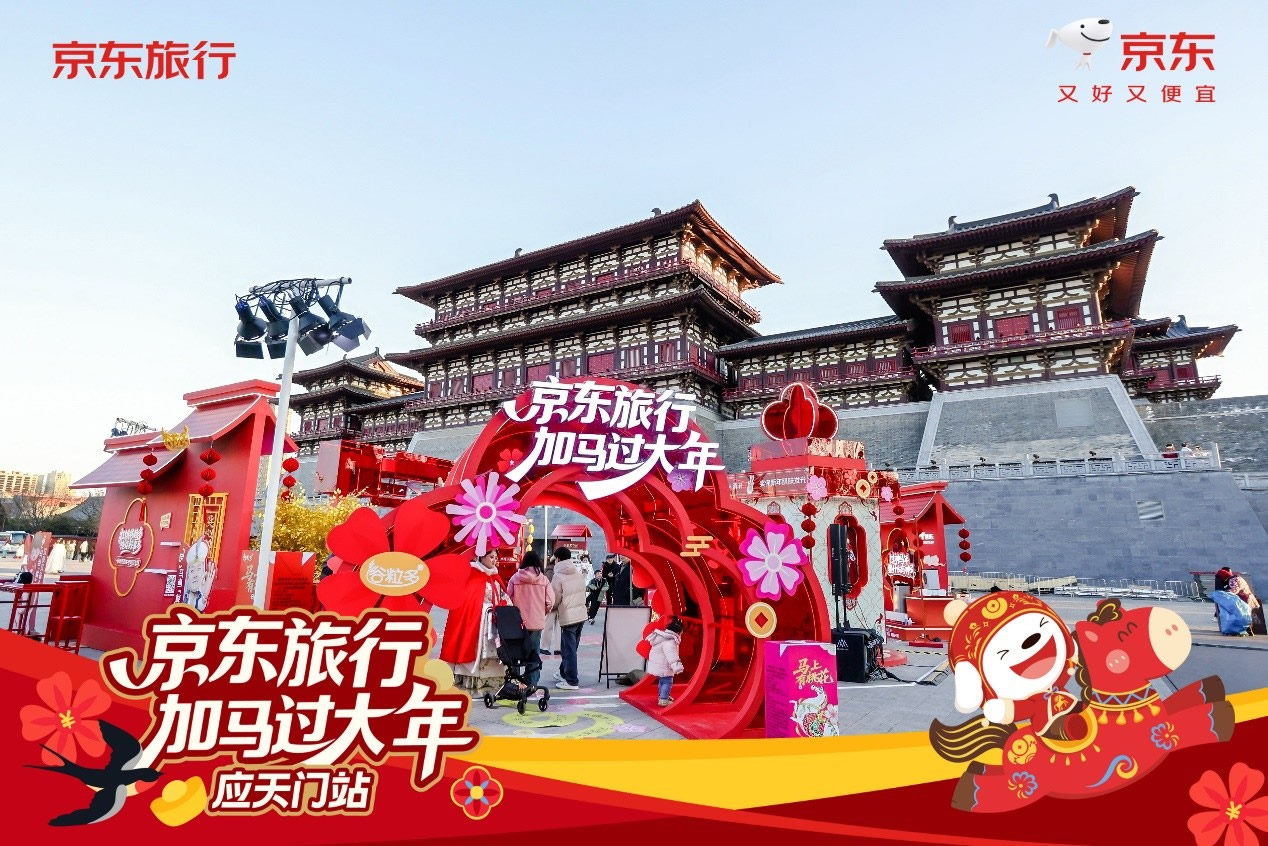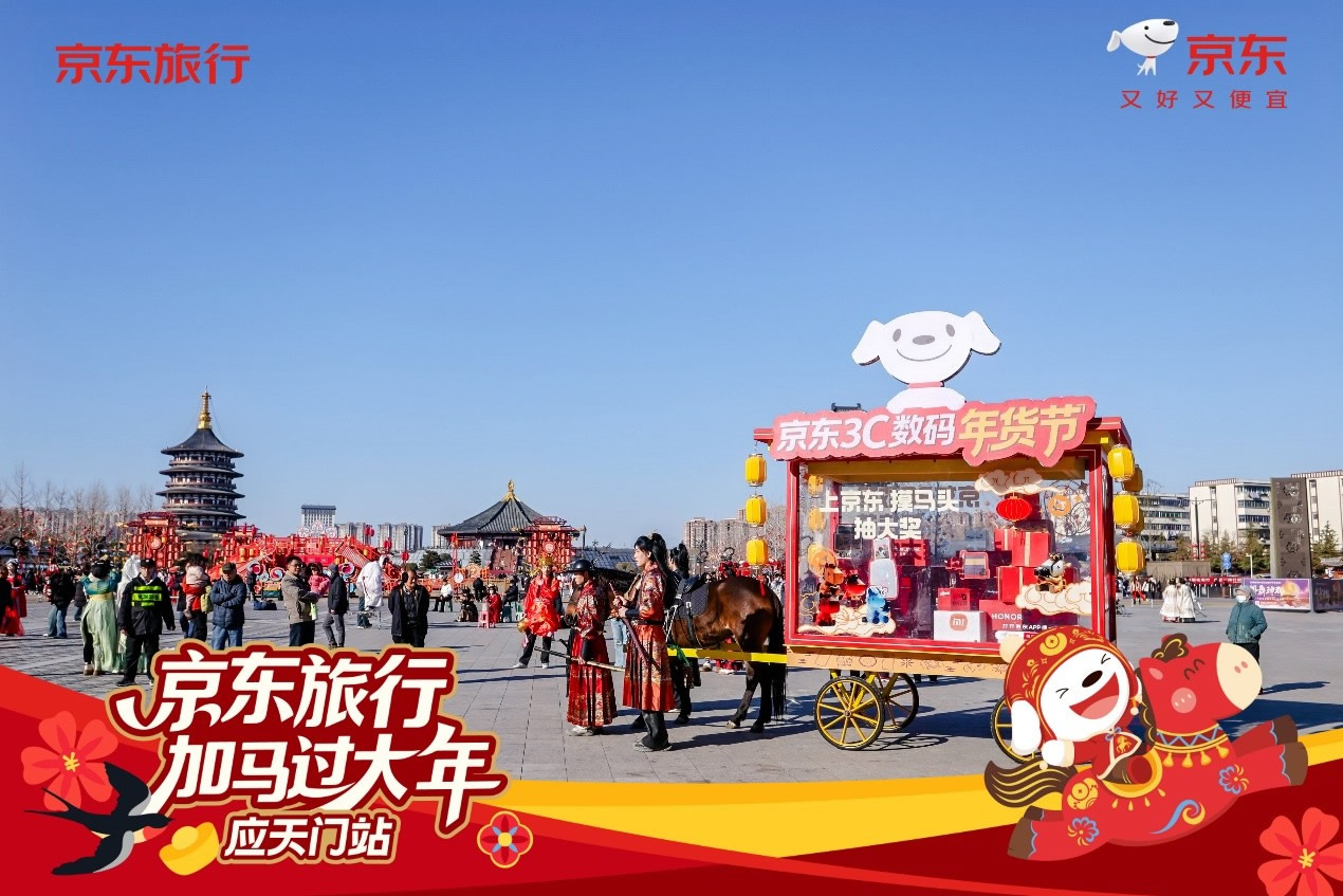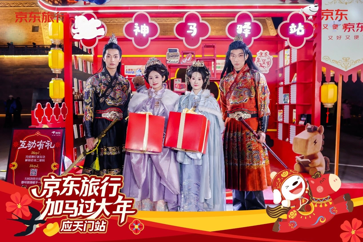 與此同時,在洛陽應(yīng)天門景區(qū),京東旅行攜手京東數(shù)碼、京東物流、伊利等品類品牌,以“國風快閃”為核心形式,融合真實馬匹巡游、唐風NPC互動、馬車送年貨等話題事件,將傳統(tǒng)文化場景與品牌產(chǎn)品自然嫁接,不僅強化了景區(qū)文化體驗的鮮活感,更通過“真馬營銷”等創(chuàng)新手段在社交平臺形成二次傳播,成功塑造了“文旅+品牌”的場景營銷新范式。