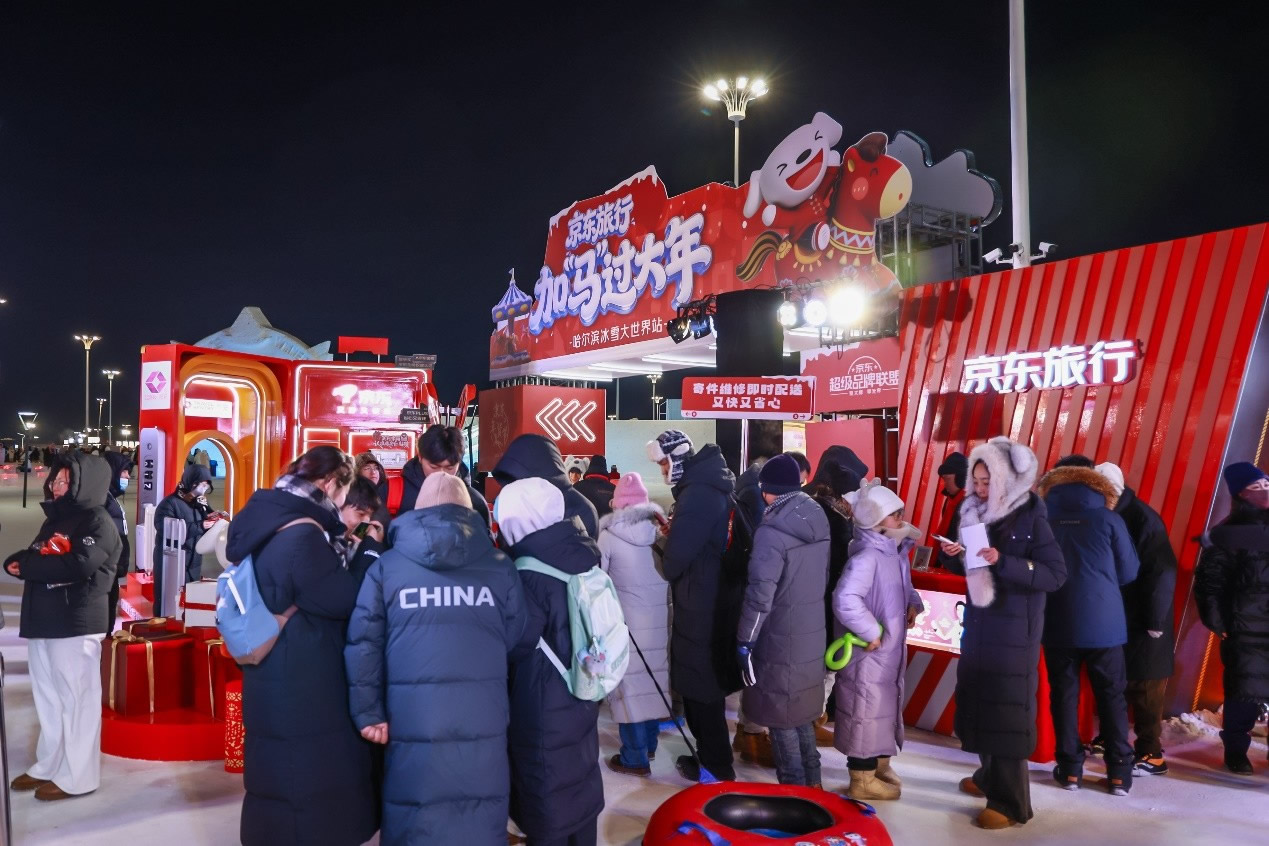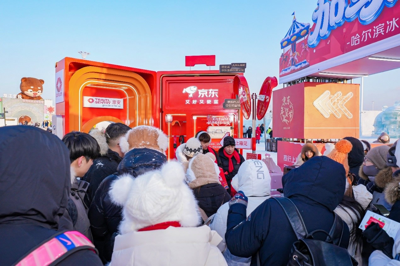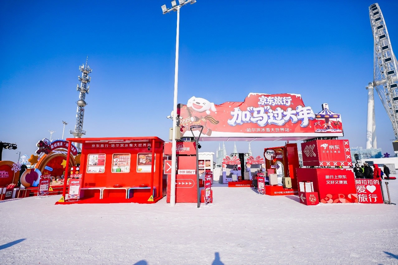 京東旅行在此次年貨節(jié)中深度融合兩大頂流文旅場景,實現(xiàn)線下事件與品牌傳播的雙重引爆。在哈爾濱冰雪大世界,京東旅行攜手京東箱包、京東健康、超級品牌聯(lián)盟、旅安、歐舒丹等品類品牌,依托其冬季頂流景區(qū)的話題熱度,通過多維互動營銷方式打造沉浸式跨界體驗:不僅設(shè)置“冰雪年貨快閃活動”開展品牌展示與互動游戲,更通過地標冰雪摩天輪、無人機表演、冰雪大舞臺廣告/立體字/主持人口播、區(qū)域植入品牌立體廣告等豐富營銷形式,共同實現(xiàn)品牌與景區(qū)流量的深度共振。