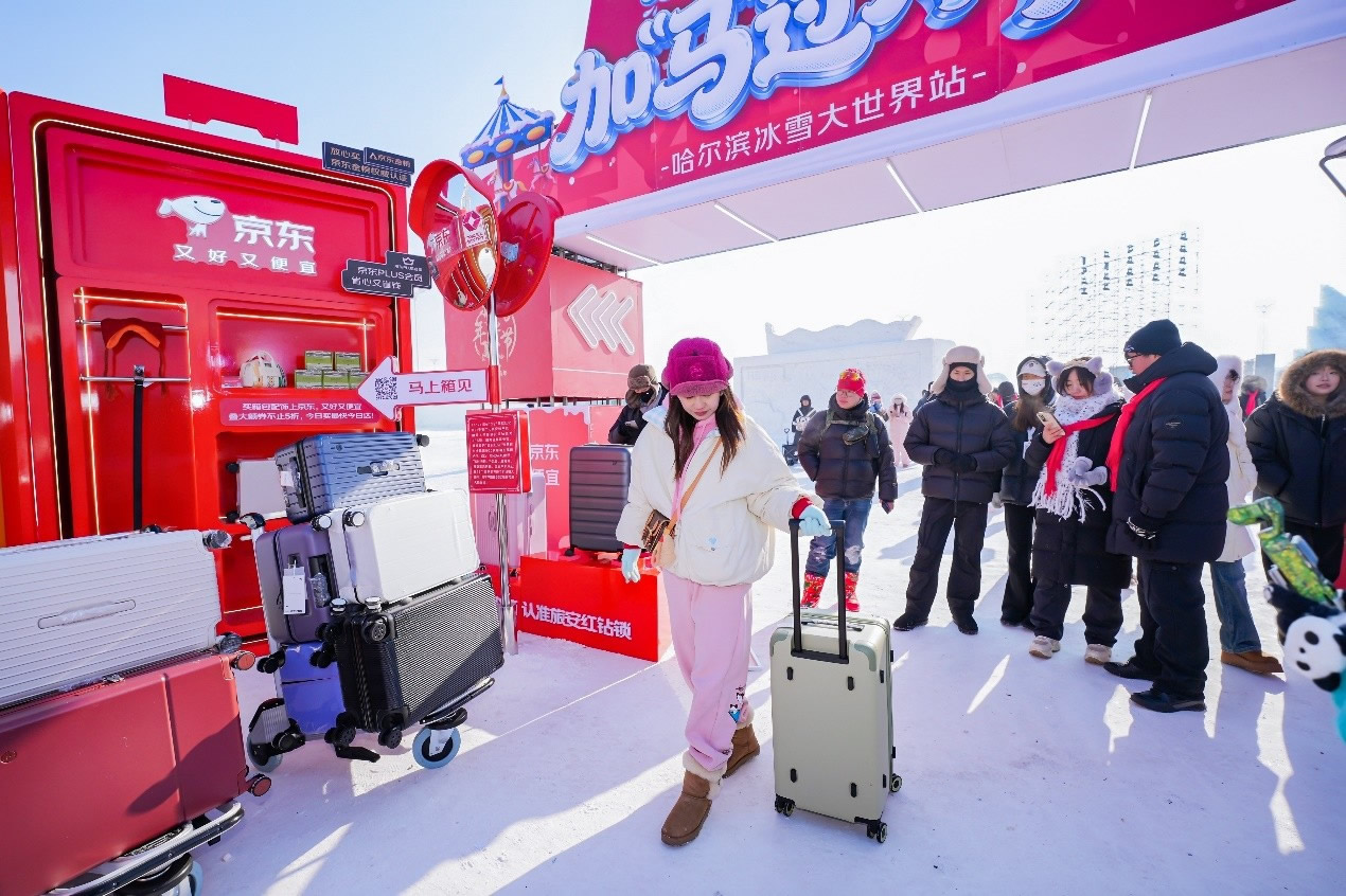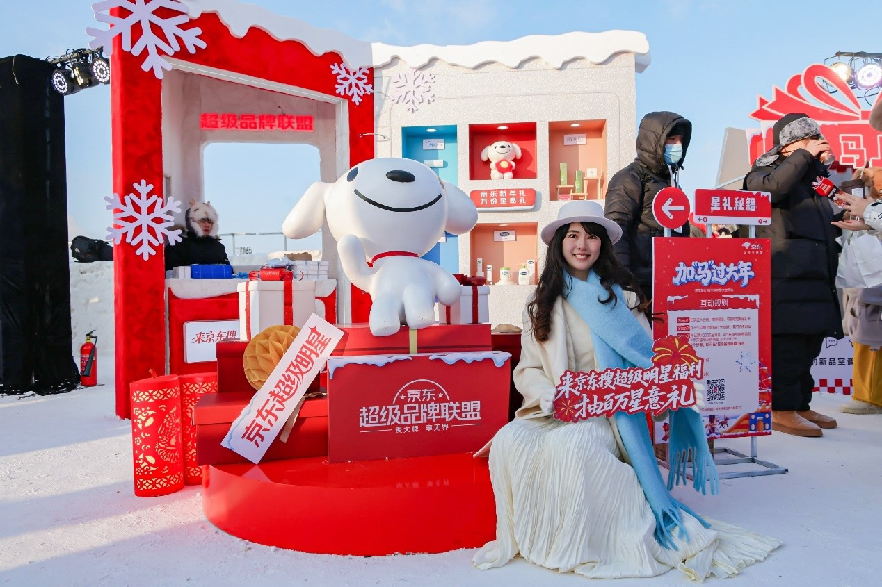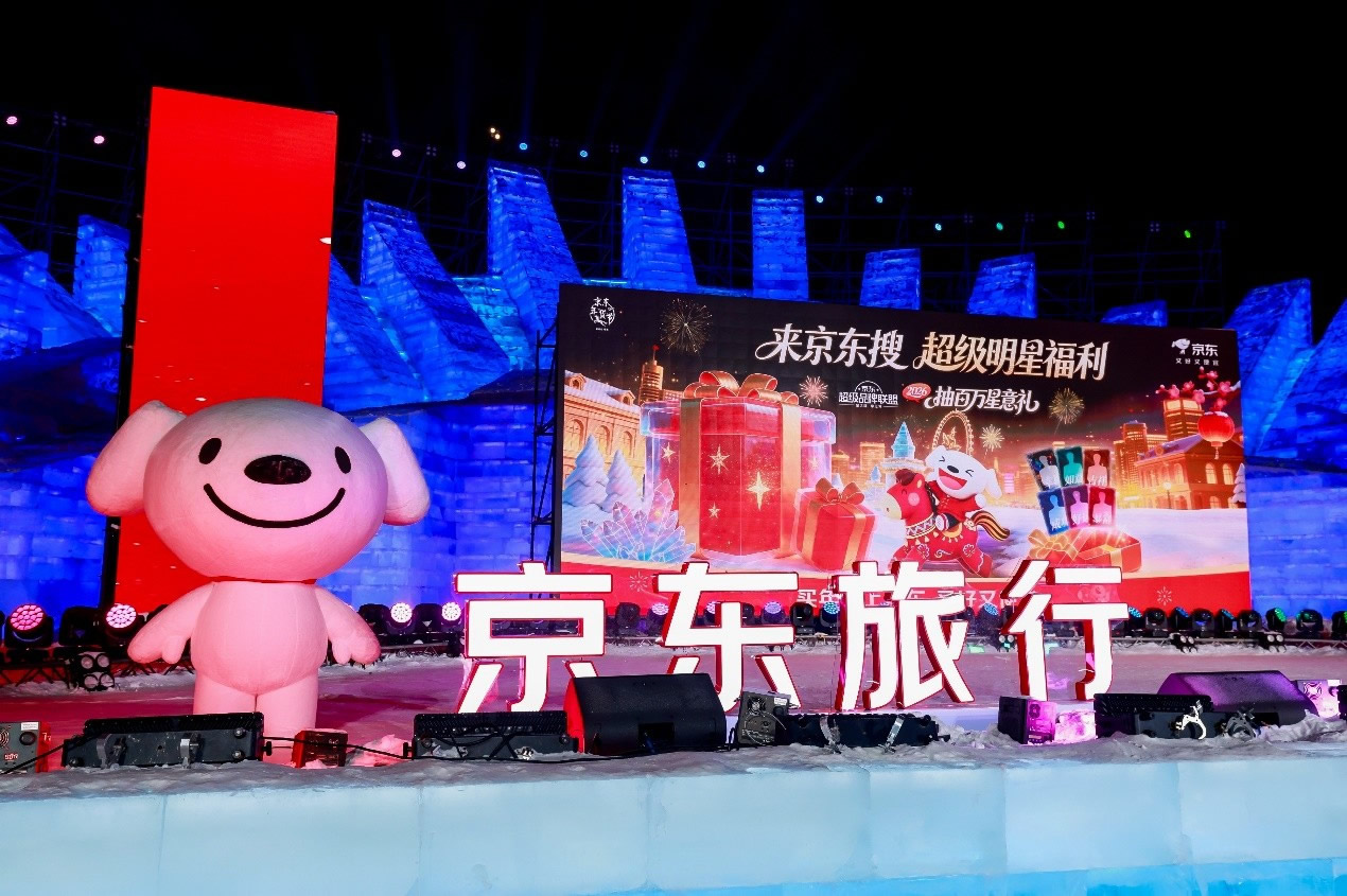 京東旅行在此次年貨節(jié)中深度融合兩大頂流文旅場景,實現(xiàn)線下事件與品牌傳播的雙重引爆。在哈爾濱冰雪大世界,京東旅行攜手京東箱包、京東健康、超級品牌聯(lián)盟、旅安、歐舒丹等品類品牌,依托其冬季頂流景區(qū)的話題熱度,通過多維互動營銷方式打造沉浸式跨界體驗:不僅設(shè)置“冰雪年貨快閃活動”開展品牌展示與互動游戲,更通過地標冰雪摩天輪、無人機表演、冰雪大舞臺廣告/立體字/主持人口播、區(qū)域植入品牌立體廣告等豐富營銷形式,共同實現(xiàn)品牌與景區(qū)流量的深度共振。