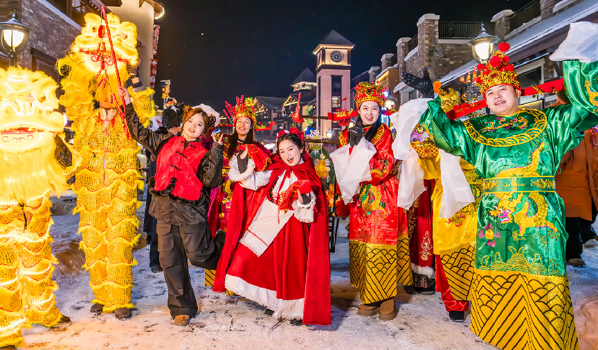 夜幕降臨,巡游隊伍走上度假區(qū)的街頭,讓游客在冰天雪地中感受到濃濃熱情。