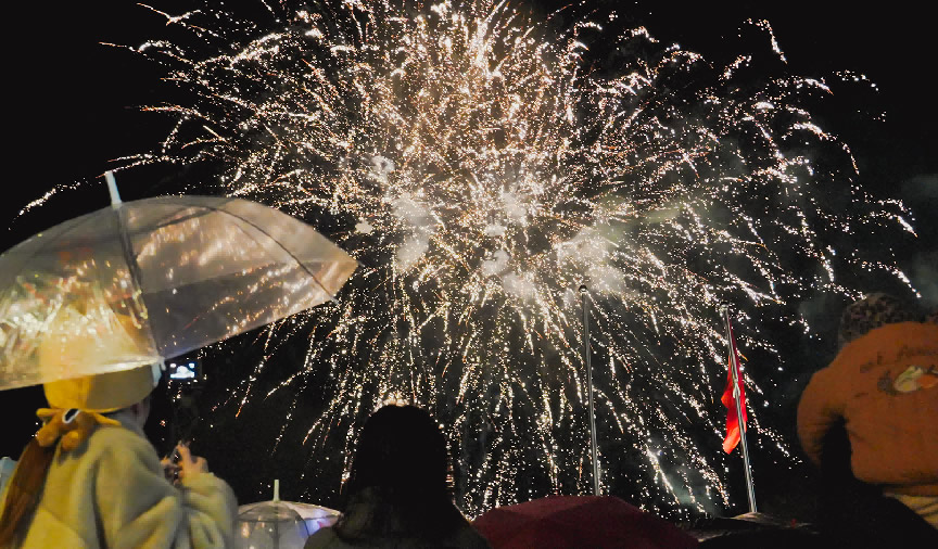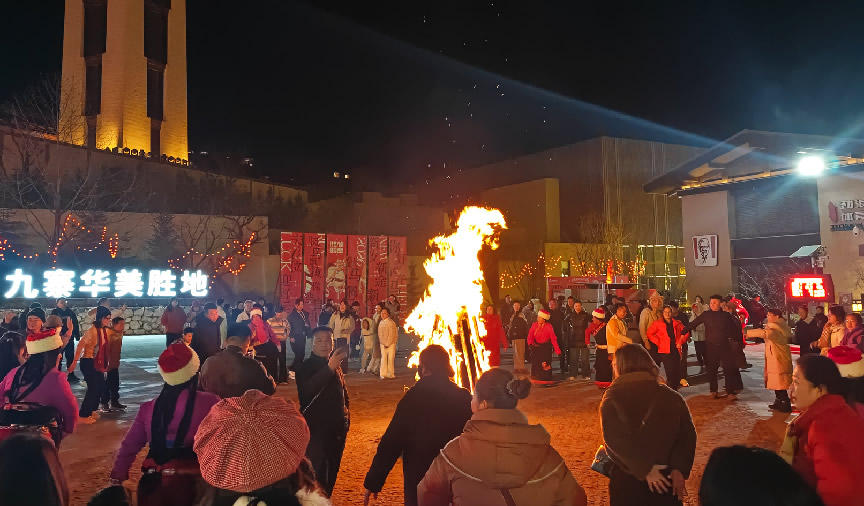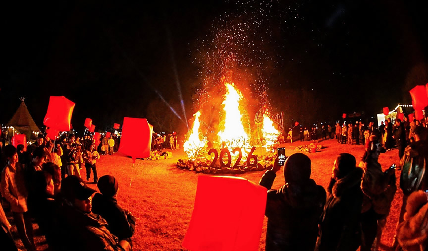 在京南華美勝地,游客們歡聚一堂,點燃跨年篝火,慶祝新年到來。