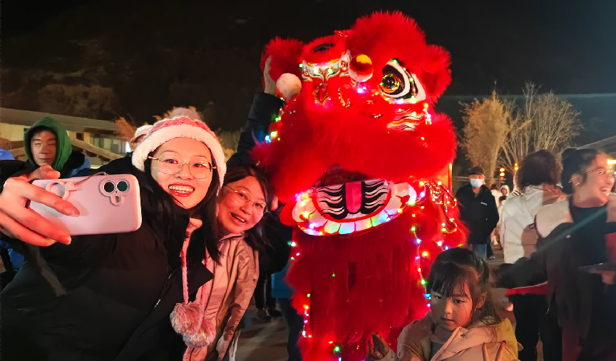 游客與度假區(qū)內(nèi)的福獅合影互動,討個新年“好彩頭”。