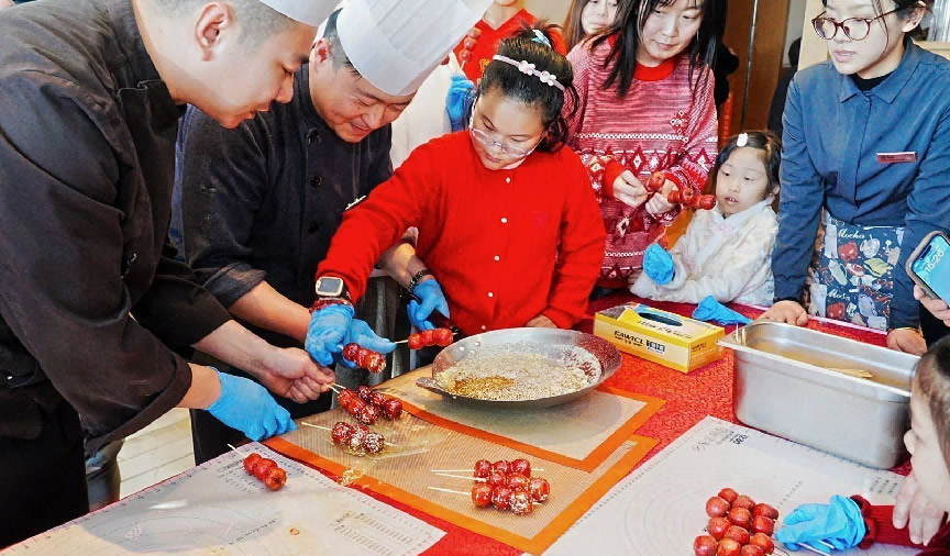 在工作人員的指導(dǎo)下,游客們體驗手工制作糖葫蘆。