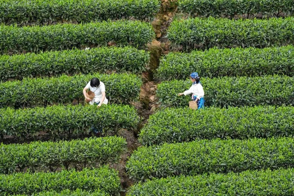 4月5日,人們?cè)谒拇ㄊ⊙虐彩信D肫喝f畝觀光茶園體驗(yàn)采茶。新華社記者胥冰潔 攝