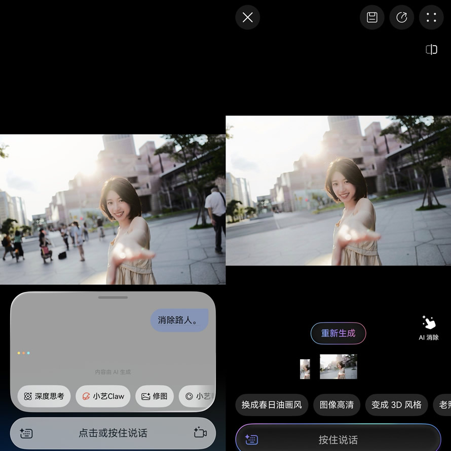 打開(kāi)照片后,只需喚醒小藝說(shuō)一句“幫我把后面的路人消除掉”,小藝便能精準(zhǔn)識(shí)別路人進(jìn)行消除,并自然補(bǔ)全背景。