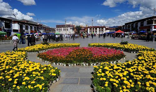 底層售票處,有樓梯可以直通二樓和三樓的平臺(tái)。在平臺(tái)上遠(yuǎn)眺:布達(dá)拉宮的建筑在耀眼的陽光中光芒四射。俯視可以看到大昭寺廣場(chǎng)人流潺動(dòng),可盡覽充滿藏族生活氣息的八廓街。夏天這里還有茶座,在此可以休息。