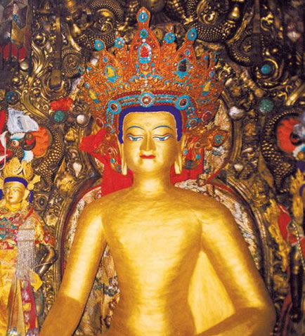 繼續(xù)右繞,穿過兩邊的夜叉殿和龍王殿,數(shù)百盞點(diǎn)燃的酥油供燈的后面便是著名的“覺康”佛殿。它既是大昭寺的主體,也是大昭寺的精佛之所在。佛堂呈密閉院落式,樓高四層,中央為大經(jīng)堂。藏傳達(dá)室佛教信徒認(rèn)為拉薩是世界的中心,而宇宙的核心便在于此處。這里是大昭寺僧人誦經(jīng)修法的場(chǎng)所。從大經(jīng)堂正可遙遙看見造型精美的千手千眼觀世音塑像,兩側(cè)有兩尊佛像,左為蓮花生,右為強(qiáng)巴佛塑像。大經(jīng)堂的四周俱為小型佛堂,除位于正中心的釋迦牟尼佛堂外,開間均不大但布置簡(jiǎn)潔。釋迦牟尼佛堂是大昭寺的核心,這里是朝圣者最終的向往。此殿供奉的釋迦像是文成公主所帶的佛像。