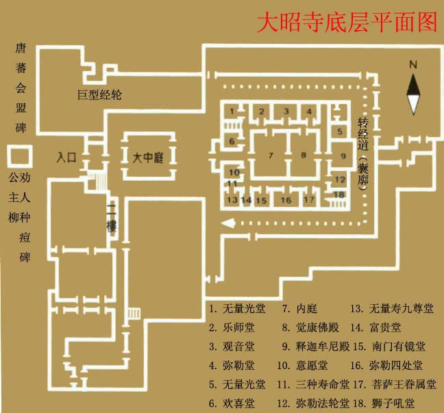 從大昭寺金頂可以看到大昭寺廣場(chǎng),右邊遠(yuǎn)處山上是布達(dá)拉宮,近處的柳樹是“公主柳”,相傳是文成公主所栽。大昭寺的布局方位與漢地佛教的寺院不同,其主殿是坐東面西的。主殿高四層,兩側(cè)列有配殿,布局結(jié)構(gòu)上再現(xiàn)了佛教中曼陀羅壇城的宇宙理想模式。寺院內(nèi)的佛殿主要有釋迦牟尼殿、宗喀巴大師殿、松贊干布殿、班旦拉姆殿(格魯派的護(hù)法神)、神羊熱姆杰姆殿、藏王殿等等。寺內(nèi)擁有各種木雕、壁畫。