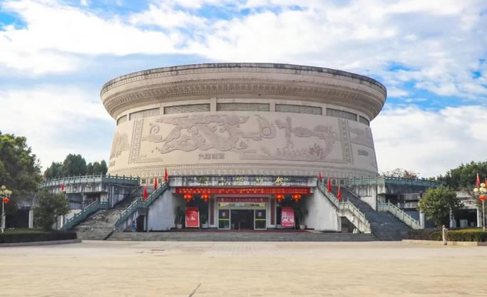 保山市博物館,位于保山中心城市文化中心(三館廣場)正中,占地8畝,坐南朝北。館舍為仿本地出土古代銅鼓造型,通高19.6米,最大直徑56.6米。是保山市重要的標志性文化設施。建筑面積4500平方米,展廳面積3000平方米。