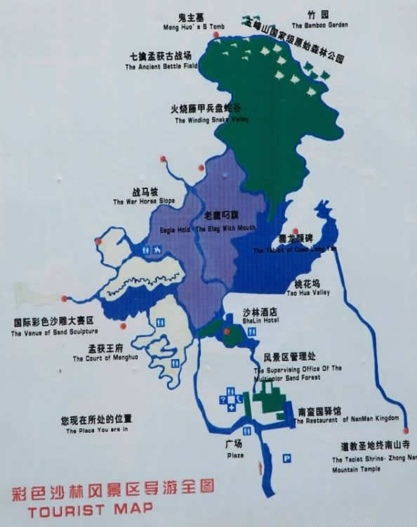 沙林采用《易經(jīng)》原理興建的門庭,以及全國(guó)最大的《爨史》浮雕,還有中央電視臺(tái)拍攝《三國(guó)演義》留下的孟獲寨門、王府等,頗具觀賞價(jià)值。彩色沙林附近,還有全國(guó)著名的爨龍顏碑,以及世界古地地理標(biāo)志“牛頭山古陸”及“玄帝公”寺,五峰山國(guó)家原始森林等景觀。