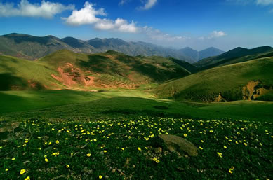 草甸、鮮花、小溪、藍天、白云、羊群,構(gòu)成了一幅優(yōu)美迷人的圖畫。