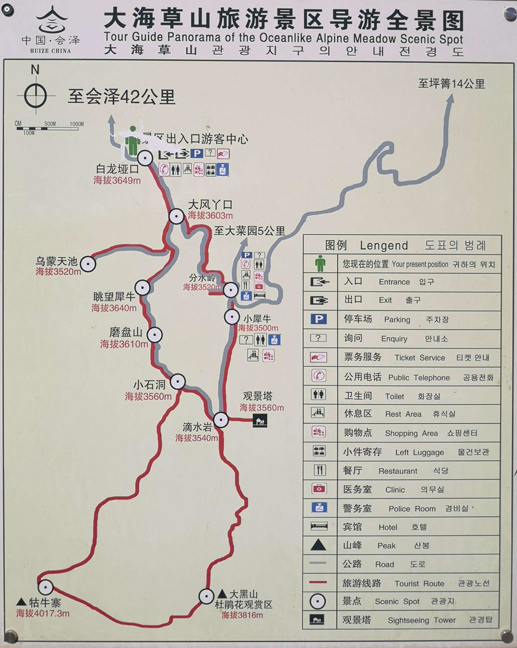 大海草山的最高峰牯牛寨峰,海拔4017米,直沖云霄,凌空霸世,據(jù)《東川府志》載稱:“重崗絕山,高三十余里,危峰矗立,常有云氣覆之,每當晴日,蒼翠欲滴,滇中四、五百里皆見之!