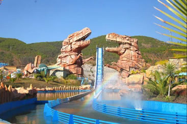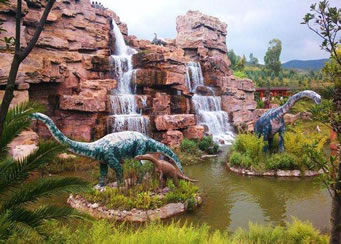 由“侏羅紀(jì)大瀑布”、“群龍對峙”、“腕龍相親”、“氣龍追逐”、“雙龍飲瀑”、“霸王龍窺獵”、“侏羅紀(jì)叢林”、“海棗之王”、“沙漠之林”等九大景觀真實再現(xiàn)了侏羅紀(jì)時代恐龍王國的生活場景,構(gòu)造出一個1億年前生氣勃勃、繁榮昌盛的侏羅紀(jì)世界,讓游客飽享一頓視覺大餐。