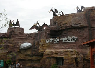 時空飛船:在一個不起眼的洞窟崖壁上有一架墜毀的飛船。進入洞窟是一座神秘的飛船發(fā)射基地,從這里就是游客將乘坐“時空飛船”飛越侏羅紀(jì)。飛船會進入神秘的時光隧道,游客將親歷地球生命演變和進化的過程,在短短10分鐘內(nèi)走完地球生命幾十億年的演化歷程,最后進入到侏羅紀(jì)世界。