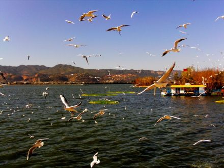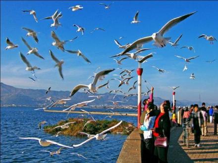 滇池位于昆明市南的西山腳下,其北端緊鄰昆明市大觀公園,南端至?xí)x寧縣內(nèi),距市區(qū)5km,歷史上這里一直是度假觀光和避暑的勝地。滇池形似弦月,南北長39km,東西寬13.5km,平均寬度約8km。湖岸線長約200km;湖面面積300k㎡,居云南省首位,湖水最大深度8m,平均深度5m,蓄水量15.7億,素稱“五百里滇池”。是中國第六大內(nèi)陸淡水湖。