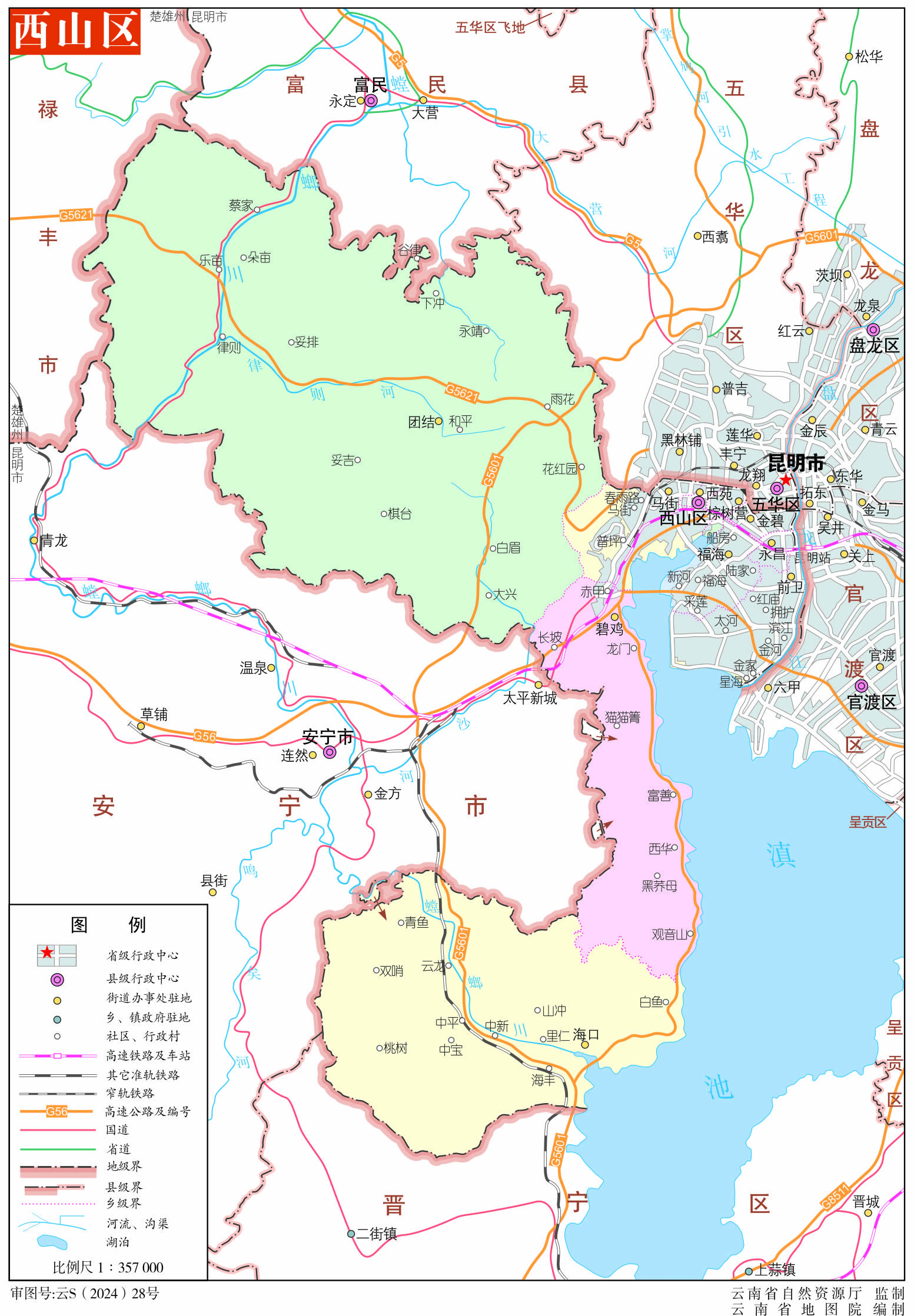位置境域 西山區(qū)位于滇池西北岸,昆明市西部。東臨滇池,與官渡區(qū)、呈貢區(qū)隔水相望,與五華區(qū)土地相連,東北隅與官渡區(qū)、嵩明縣毗鄰。南接晉寧縣,西靠安寧、祿豐,北同富民縣接壤。東西寬36.8千米,南北長72千米,總面積881平方千米。