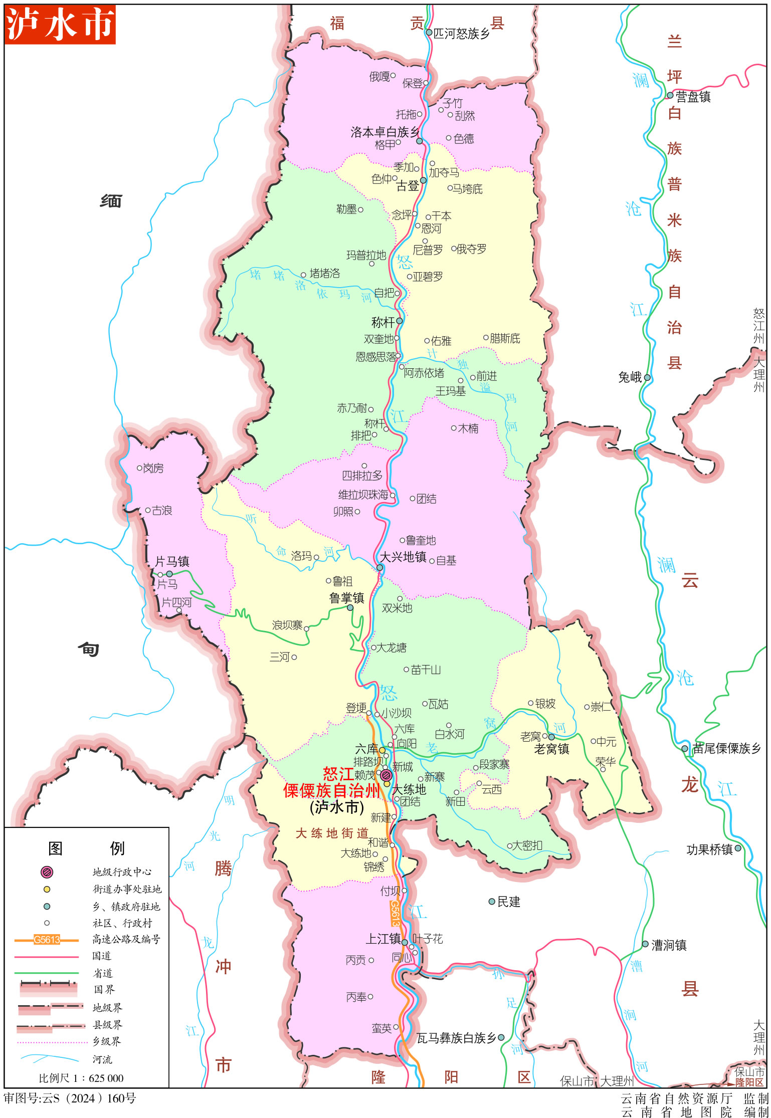 位置境域 瀘水市,位于云南省西北部,怒江傈僳族自治州南部,東靠碧羅雪山,與蘭坪、云龍兩縣相鄰,南接保山市,西與騰沖縣和緬甸聯(lián)邦共和國毗鄰,北連福貢縣。最大橫距58千米,最大縱距108千米,面積3203.04平方千米,駐地六庫距云南省會(huì)昆明569千米。