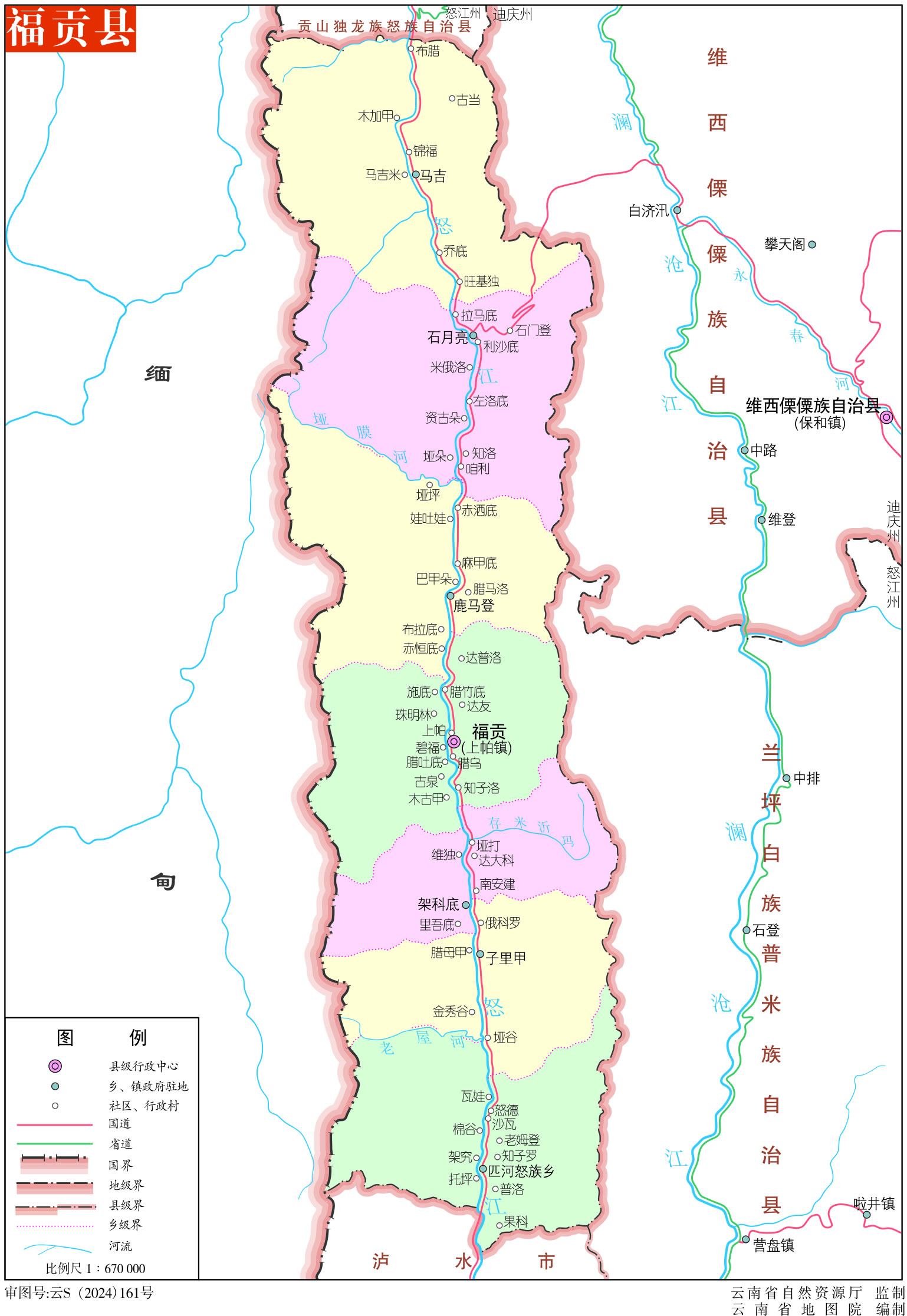 位置境域 福貢縣東連維西、蘭坪兩縣,南臨瀘水縣,北接貢山縣,西與緬甸聯(lián)邦毗鄰,國境線長142千米。總面積2756.44平方千米。