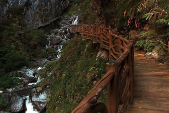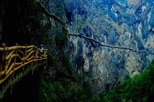 、诟呖諚5捞诫U游路:福緣橋——龍王廟——天開石門——鶴峰亭——五道水服務(wù)區(qū)——高空玻璃棧道——七彩玻璃觀景平臺——高空棧道——七道水彩虹橋——七道水瀑布——野生芭蕉林——百步天梯——萬獸谷——枯木要塞。全長3500米,