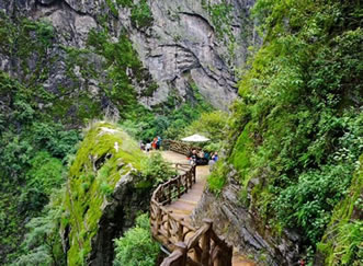 、俨叫杏温罚焊>墭颉埻鯊R——天開石門——鶴峰亭——五道水服務(wù)區(qū)——枯木要塞——萬獸谷——百步天梯——野生芭蕉林——七道水彩虹橋,全長2500米;