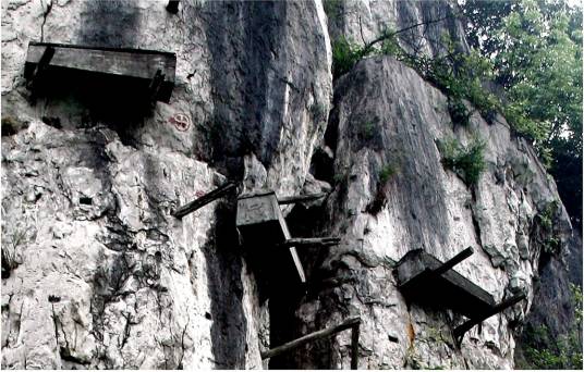 瓦石僰人懸棺位于威信縣長安鄉(xiāng)瓦石行政村棺木崖和白虎巖上,與四川省珙縣僰人懸棺相同。棺前為林鳳河瓦石段。由于大量朽壞脫落,現(xiàn)懸棺3具,復制4具后計7具,民間傳說為何姓“白人子”墓。明代以前遺物,石上鑿孔,插入厚木,棺凌空橫置木上,任憑風吹雨打。 掛于數(shù)百米懸崖絕壁上,是神秘和求知的象征。懸棺雖然經(jīng)過部分整理,但原貌基本尚存。2000年,已由奧地利王妃出資進行保護。從山下仰望萬仞絕壁上的懸棺,給人的絕非是神秘和震撼的感覺。