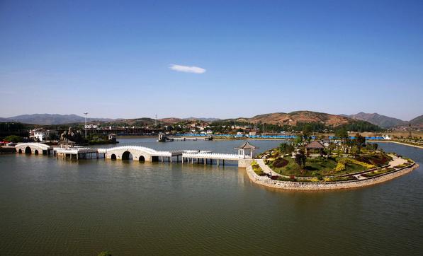 太陽湖位于縣城南郊,東臨巧威公路過境線,西接鳴樓自然村,占地面積320畝。園區(qū)整體布局主要由水體湖面、小島嶼、環(huán)湖公路和商業(yè)區(qū)四個部分組成。太陽湖呈蝴蝶型鑲嵌于城郊平壩中央,水體面積為16萬平方米,湖面水深2.2米。湖畔有島嶼3個,在島上設(shè)置了八角亭及長廊等江南風(fēng)格園林設(shè)施,拱型廊橋?qū)⒐聧u與小島連為一體,形成湖中有島、小島四面迎水的秀美景觀。