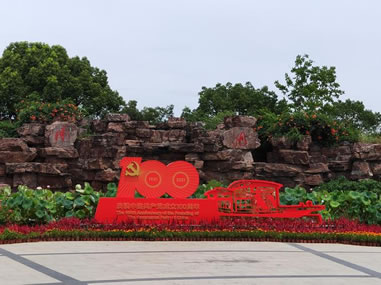 是為紀念中國共產(chǎn)黨第一次全國代表大會在南湖閉幕而建造的一座革命紀念館。作為中共“一大”會址重要場館和黨的誕生地,1959年根據(jù)有關部門的決定,經(jīng)中央審查同意,嘉興市籌建南湖革命紀念館,不僅仿制了南湖畫舫,還在湖心島建立了南湖革命紀念館,紅船?康暮男u成為最初的館舍,于煙雨樓大廳中開辟中共“一大”史料陳列。1991年7月,為慶祝中國共產(chǎn)黨成立70周年,紀念館移建南湖北岸,由鄧小平同志題寫?zhàn)^名,建設資金主要由黨員自愿捐獻。建成的紀念館由鐮刀、錘子形組成的紀念性建筑物,占地面積3800平方米,建筑面積1980平方米。紀念館坐北朝南,廣場上有高大威嚴的宣誓臺和大型石雕照壁以及四個火炬型花壇。在鮮花擁簇下,紀念館顯得莊嚴雄偉。沿著臺階進入陳列大廳,正面是一艘南湖紅船模型和“中國共產(chǎn)黨第一次全國代表大會史料陳列”,兩個展廳分別布置了《中國共產(chǎn)黨第一次代表大會史料陳列》、《黨和國家領導人對南湖的關懷》等陳列,其中包括江澤民、胡錦濤、朱镕基、楊尚昆、宋平、姚依林、彭真等中央領導同志前來參觀、考察的照片和江澤民、李鵬、陳云、李先念等同志為紀念館的題詞。南湖革命紀念館是中國百個愛國主義教育基地之一,每年有近百萬的游人前來參觀瞻仰。