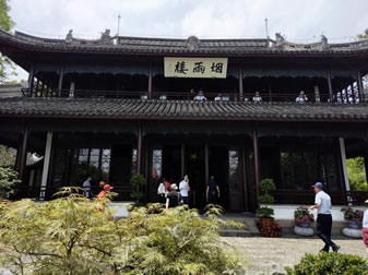 也稱大士閣,建于明朝萬歷十一年(1583),觀音閣 早年在這里面供奉觀音菩薩,用作祭祀場所。1937年大士閣曾被日軍的炮火炸毀,1986年又重建此閣。農歷六月廿四日為荷誕(荷花生日,古稱觀蓮節(jié)),以前嘉興地方上早早地或自發(fā)、或商界集資精心制作各種荷花彩燈到南湖進行放燈活動。普通的荷花燈為木制底板,上面圍扎粉紅色半透明花瓣,勃勃怒放,花蕊可插蠟燭。是日,商界同仁或有錢人家包租了絲網(wǎng)船,泛舟游湖。船上設盛宴飲樂之外,有的還請了民樂隊隨船伴奏助興。煙雨樓大士閣歷來香火旺盛,但最盛的是六月廿四日,四鄉(xiāng)八圩的信徒會聚湖心島,敬香拜佛,同時一觀荷花燈盛況。是夜嘉興人幾乎傾城而出,涌向湖濱。湖里船上、煙雨樓上以及湖濱岸上人山人海。待天暗下來,無數(shù)只荷花燈點亮蠟燭,從船上、島上、湖邊放入水中,浮于碧波。花燈隨微風細浪、人潮氣浪悠悠蕩漾。千萬盞游動的荷花燈,映照著綠菱嫩荷,乘著習習涼風,載著陣陣歡笑,在幽幽絲弦聲中蕩漾。
