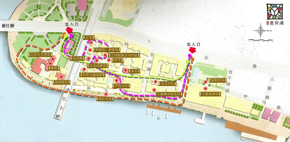 沿著江邊,外國(guó)領(lǐng)事館、天主教堂、銀行、輪船碼頭等建筑一字排開(kāi),幾乎記錄了寧波開(kāi)埠的整段歷史。這些建筑,至少有100多年歷史。目前保存下來(lái)的文物建筑有:英國(guó)領(lǐng)事館、巡捕房、侵華日軍水上司令部、浙海關(guān)、天主教堂、江北耶穌圣教堂、寧波郵政局、通商銀行等,還有一些民房,如老字號(hào)商鋪“宏昌源號(hào)”、中西合璧的商人私宅“嚴(yán)氏山莊”、“朱宅”等建筑,這些建筑具有濃郁的歐陸風(fēng)格。與中國(guó)傳統(tǒng)民居形成鮮明對(duì)比。經(jīng)過(guò)近幾年的培育和扶持,寧波老外灘逐步成為中心城區(qū)的高檔休閑旅游娛樂(lè)區(qū)域。