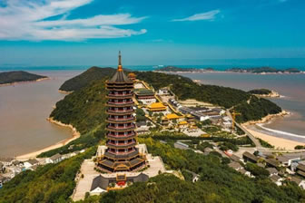 南海觀音立像位于普陀山風景名勝區(qū)之東南的龍灣崗巔。這一尊南海觀音立像總高33米,其中臺基高13米,銅像高18米,蓮花座為2米,重70多噸。佛像基層是面積1000多平方的功德廳,上層供奉500尊形態(tài)各異的觀音銅像,下層大廳飾有觀音靈異故事的大型黃楊木雕和以普陀山風景名勝區(qū)景色為題材的彩玉浮雕。