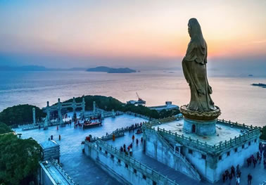 普陀山,位于浙江省舟山市普陀區(qū),杭州灣南緣,舟山群島東部海域,相傳是觀世音菩薩教化眾生的道場。普陀山地形呈菱形狀,是舟山群島1390個島嶼中的一個小島,形似蒼龍臥海,面積12.52平方千米,與舟山群島的沈家門隔海相望,素有“海天佛國”、“南海圣境”之稱,南北長8.6千米,東西寬約3.5千米,岸線長30千米。中部佛頂山天燈臺最高,海拔291.2米,向四面延伸,西為茶山,北為伏龍山,東為青鼓壘山,東南為錦屏山、蓮臺山、白華山,西南為梅岑山,主峰均在100至200米間,連綿起伏。