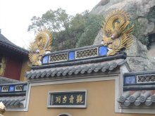 法雨寺又稱后寺,初名海潮庵,清康熙三十八年(1699年)賜“天華法雨”額,遂稱法雨禪寺。建筑布局依山取勢,分群遞升。其中九龍殿最為輝煌,該佛殿是從南京明故宮整體搬遷而來的,殿內有普陀山三寶之一的“九龍藻井”。