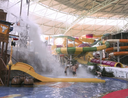 水之王國場館擁有室內(nèi)沙灘、超大型組合滑道(異域湍流)、冰谷漂流等項(xiàng)目設(shè)施。